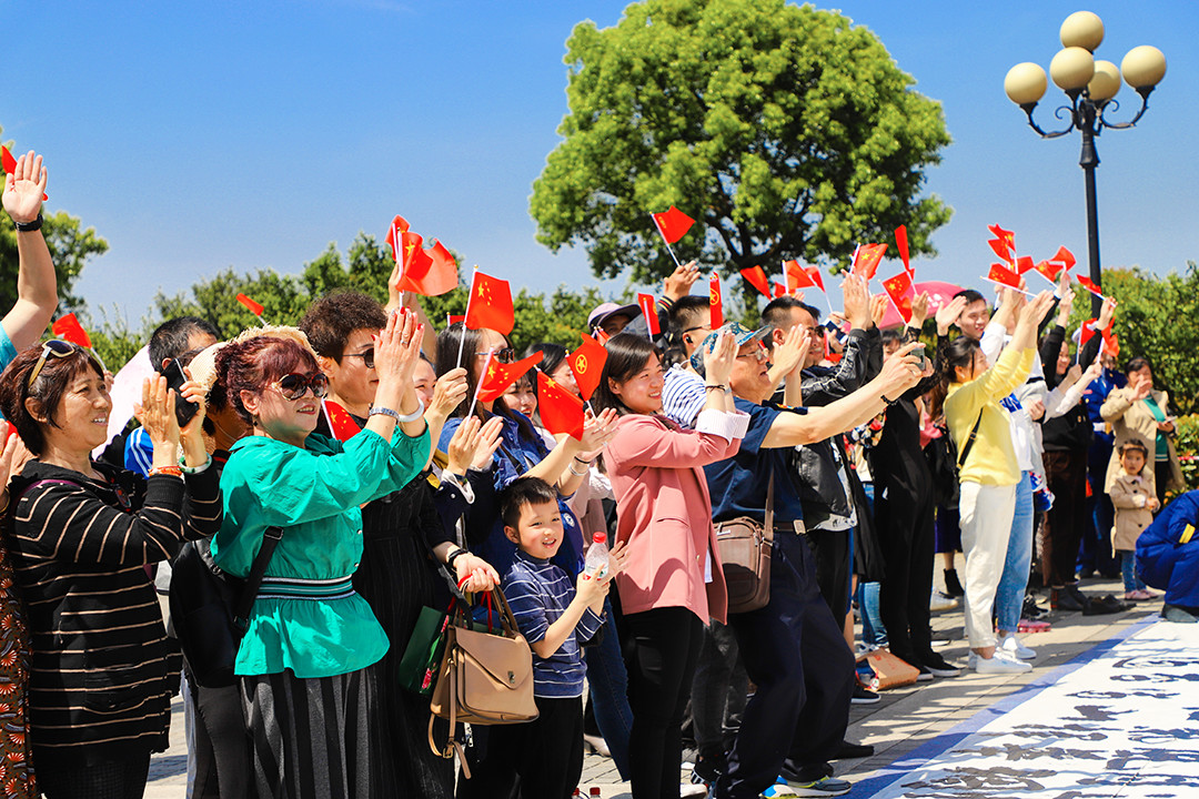 随后,全体消防指战员集体朗诵《沁园春 长沙》。饱含深情、铿锵有力的朗读声响彻整个橘子洲头,深深地感染了在场的每一名游客。“场面太震撼了,看到这些年轻的指战员们,我为祖国的强大感到自豪,为我们有这样的消防英雄而骄傲!”,现场观众跟随朗诵声挥舞小国旗,在活动主题展板上写下祝福话语。