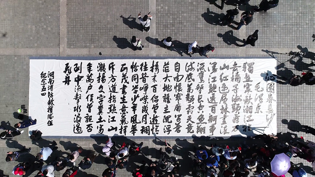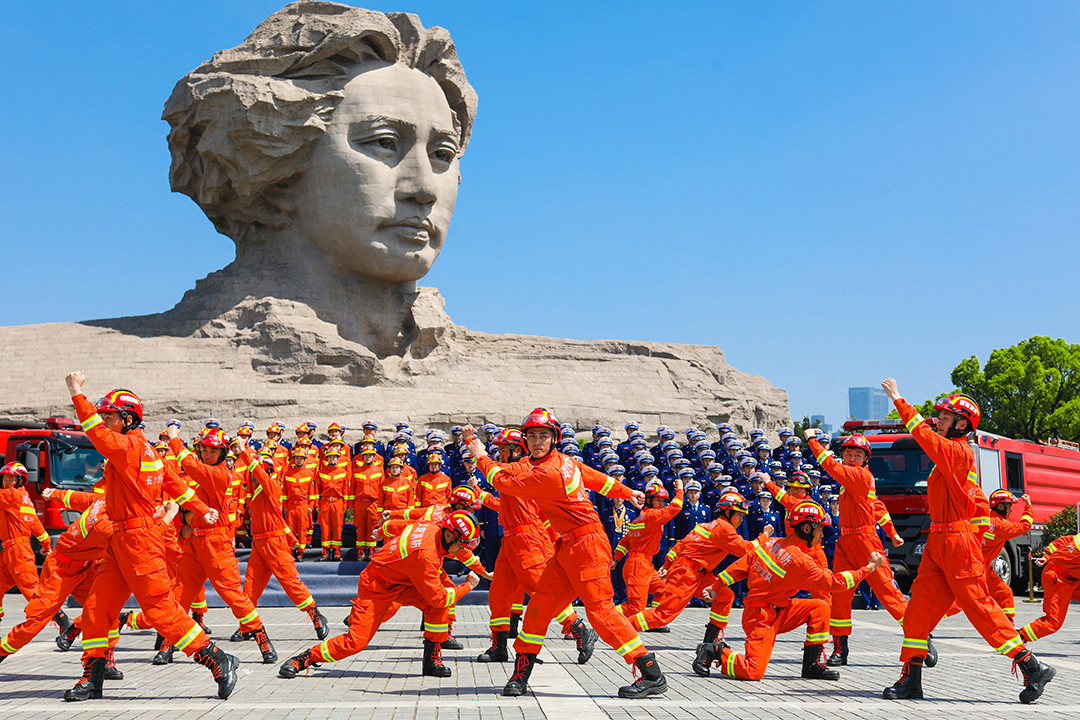 在全场欢呼声和掌声中,身着火焰蓝制服和橘红色抢险救援服的消防指战员走下舞台,在广场中央摆出“五四”队型,18米宽的中国消防救援队旗也随即拉开,巨幅书法、五四队型、巨型队旗,在毛泽东青年艺术雕像前融合成一体,格外壮观,“对党忠诚、纪律严明、赴汤蹈火、竭诚为民”,活动在全体消防指战员高昂的口号声中、在向祖国、向消防致敬声中达到高潮。