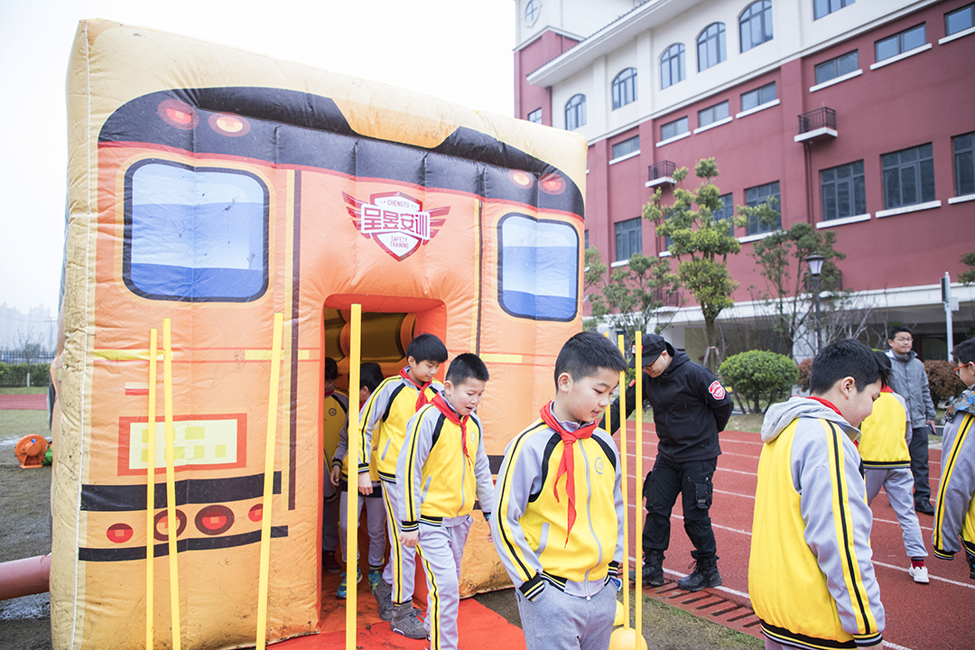 在道路交通安全演练环节,呈昱安训教官通过情境模拟,向孩子们介绍校车的基本构造、视野盲区,以及车辆应急出口位置,演示在突发情况下使用安全锤等相关的应对措施与安全技能。在精心设计制作的200m²逃生帐篷里模拟浓烟环境,呈昱安训教官向孩子们演示如何根据安全出口指示标识,采取正确的逃生姿势逃离现场,增强在烟雾中疏散逃生的自救能力。